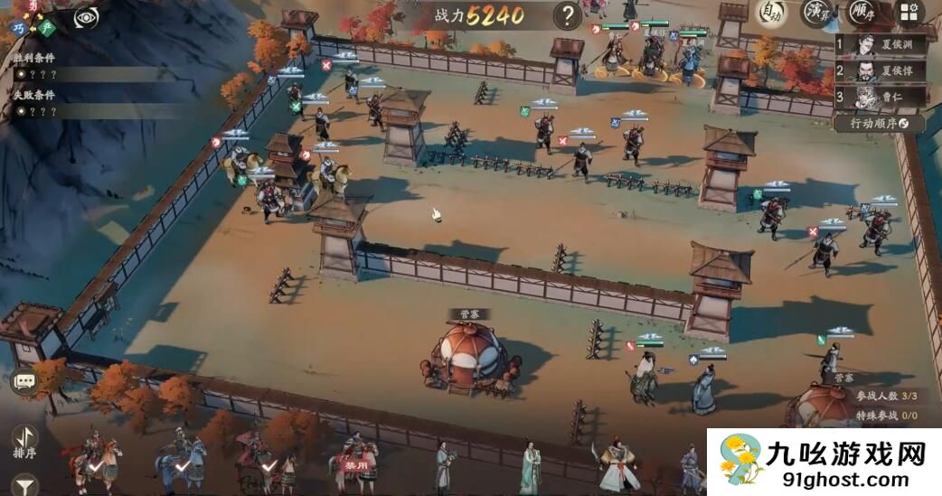 开局千万别让典韦移动,这是最重要的。贾诩会在第一回合结束时释放"尾爆"和"松懈"技能,如果典韦移动过就会中招,基本上就输定了。正确的做法是让典韦原地待命,其他武将先行动。夏侯渊可以往右走两步,用"连射"技能攻击最近的枪兵,夏侯惇则往左移动准备拦截敌人。第一回合结束时,确保典韦周围没有敌方弓箭手能攻击到他。