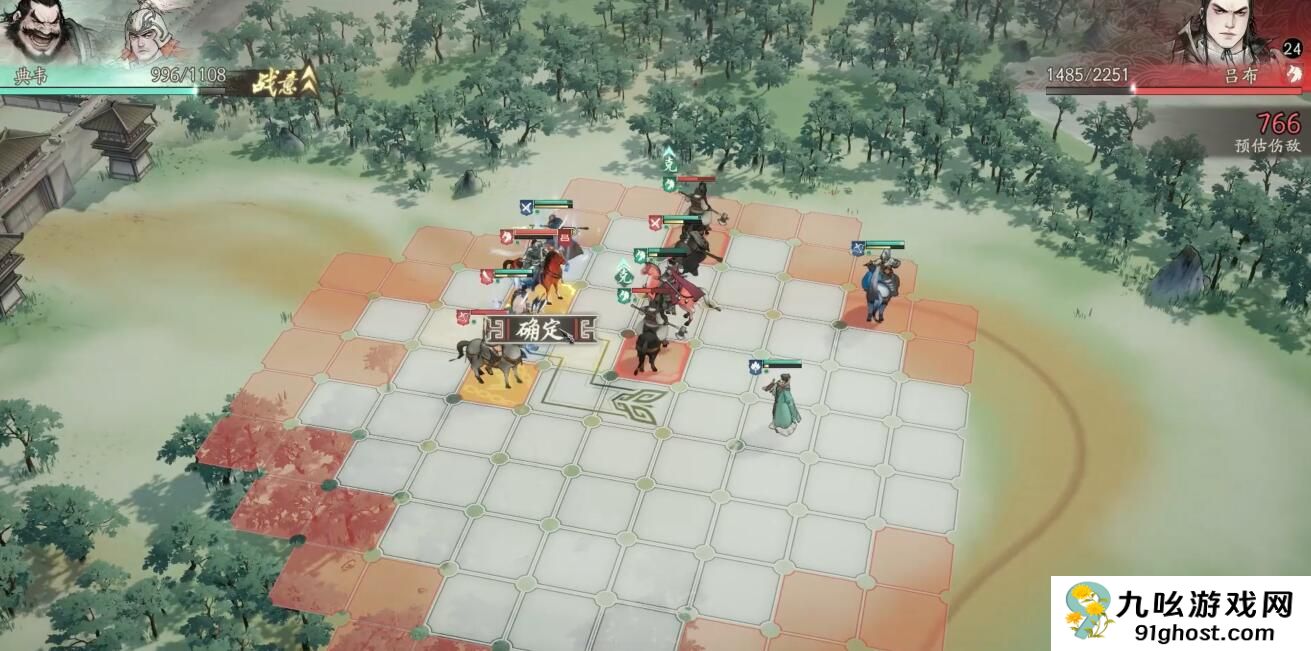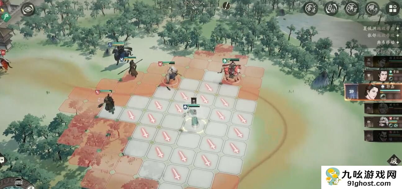开局阵容推荐典韦、张郃、许褚、郭嘉和夏侯惇。典韦放在最前排中间位置,张郃和许褚分列左右两侧,这样能形成三角防御阵型。郭嘉和夏侯惇放在后排输出位置,注意让郭嘉站在不会被吕布直接攻击到的角落。第一回合移动时,要让三个近战武将分别靠近不同的敌方小兵,为第二回合触发合击创造条件。记得把夏侯惇移动到能攻击到两个敌人的位置,这样更容易触发连携攻击。