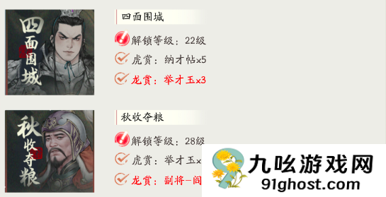 第四关是秋收夺粮,玩家需要达到28级,才能够快速解锁这一关卡,在这一关卡当中,需要注意弓箭手和骑兵的组合使用,可采用四面包围模式,快速拿下粮食。