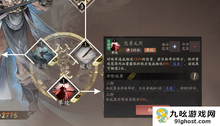 夏侯惇这个角色的核心战斗机制是他的反击机制,因此小编建议大家在转职的时候选择战车。该职业的缺点是需要牺牲一点移动力,但优点就是这一点移动力能够换来更大范围的攻击,因此总的来说还是比较划算的。在切换至战车之后,攻击范围将会覆盖到8名敌人左右,并且伤害和吸血的效率都会得到提升。其次就是战车职业可附带雪恨天赋,该天赋可使夏侯惇的兵力恢复35%,进一步的提升持续作战的能力,对于队伍的整体续航能力也有着不少提升。