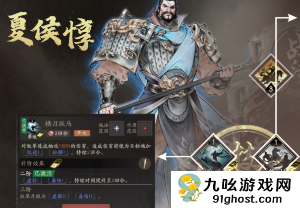 除此之外还需要为夏侯惇选择合适的技能。如果你处于前期的话,小编建议大家带一个横刀跃马,一个突进,这样的话配合被动技能雪恨,基本上能够覆盖大部分的战局。到了后期,小编比较推荐的技能是忠勇义烈和力战,其中忠勇义烈是一个收割型的技能,如果说你的场上还有其他输出的话,那么该技能可以配合主c完成收割。而力战可以让自己的攻击值和防御值得到进一步的提升,是一个非常好用的辅助技能。