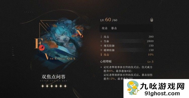 重返未来冷周六和库珀花环心相怎么样,在2.7版本中,冷周六的专属心相名为“双焦点问答”。满级后,它的攻击基值为三百八十,生命值为两千八百,双防为一百五十。在所有输出类心相中,“双焦点问答”位于第二档次。它的额外属性为10%的攻击加成,心相增幅能够增强仪式的威力和暴击伤害。装备者释放单体大招时,可以增加6%的伤害,最多叠加四层。如果释放的是群体大招,暴击伤害可以提升12%,同样最多叠加三层,换句话说,“双焦点问答”在单体C输出时,最多能够提升24%的大招威力。
