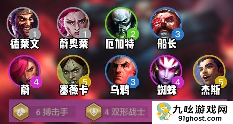 如果有搏击手换工作,也可以硬玩,可以打开更高的上限,前期可以正常使用征服搏击工作,如果有装备,可以打连胜,也可以直接留下目标卡连败,优先考虑船长的装备,7级到100层征服者奖励后,打开上图的阵容,在7级慢D船长的三星,乌鸦可以来更多的三星,然后是8到9,直到阵容形成,后续在九级梭哈找蔚或者蜘蛛的三星,如果一路连胜,也可以拿到十级D三星五费或者补六费卡来提升阵容强度。
