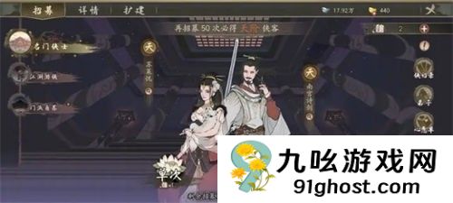 玩家可以消耗一定的招募令获取侠客招募(抽奖),有单次招募(消耗1招募令)五连招募(消耗5招募令)。