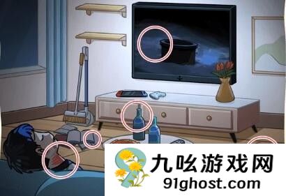 1、客厅:电视枯井、脚印、多余的瓶子、掉落的书、脖子上的掐痕。
