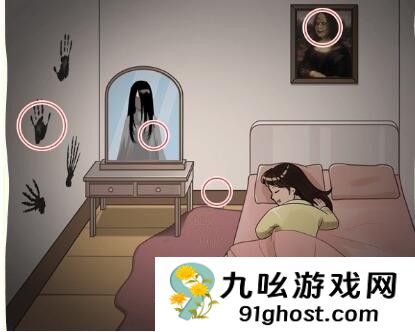 2、卧室:墙上的手印、镜子里的影子、消失的台灯、床底下的影子、诡异的画。