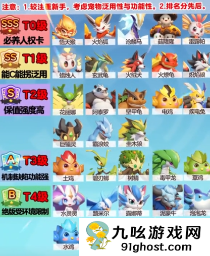 曙光重临公测1.10最新版本中T0级别的宠物有悟天猴、火焰狐、沧麟马、菇隆隆、雷霆,这些都是必养的人权卡;T1级别的有蜡烛人、玄武龟、火绒犬、火燎龟、炽焰狼。T2级别的有花丽娜、阿泰罗、坚甲龟、电鸡、疾电兔、巨锤灵、霸浪蛟、奎木狼。