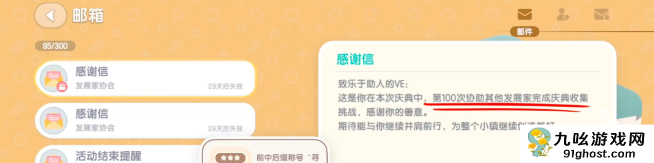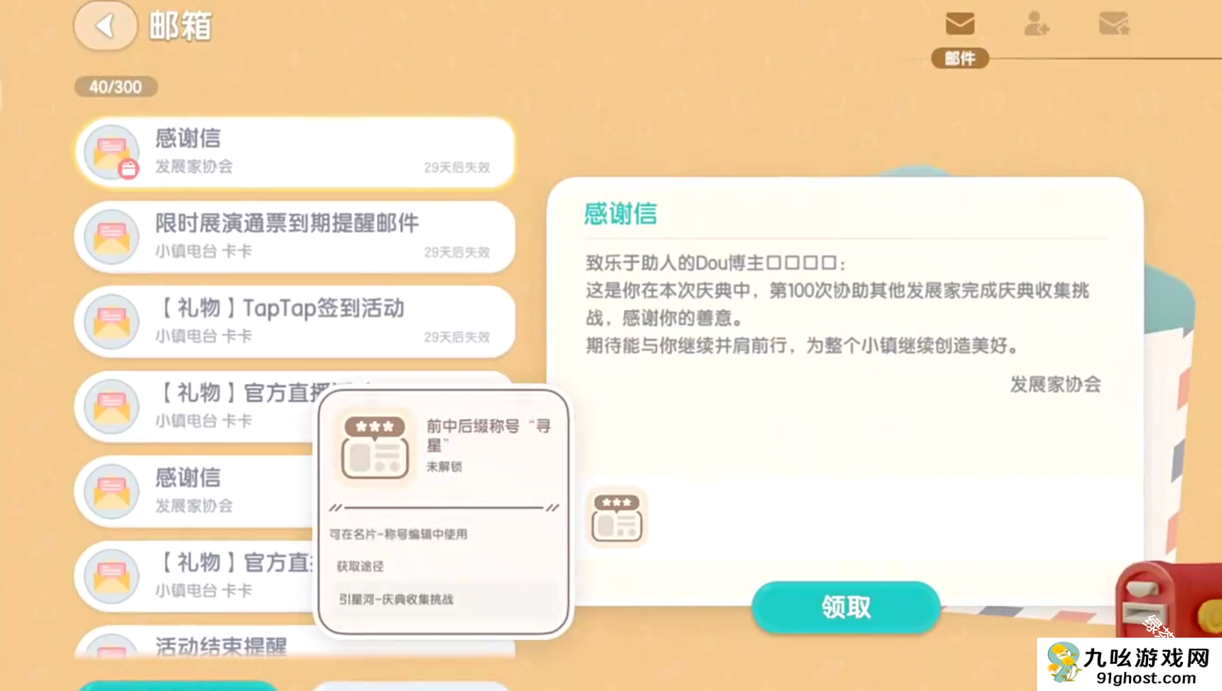 4、当完成第100次的提交任务后,我们会收到一封邮件,打开背包在邮箱中,点击【感谢信】邮件就能领取隐藏称号了;