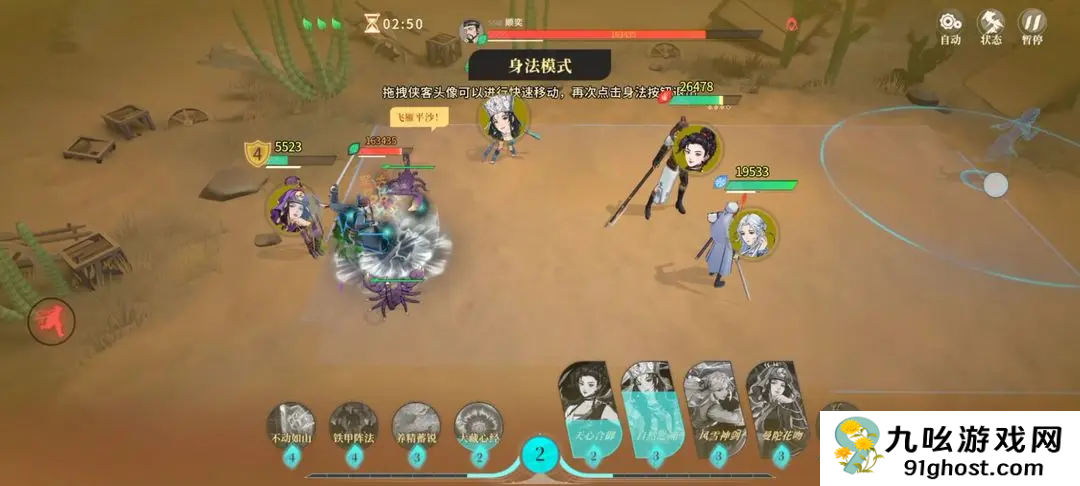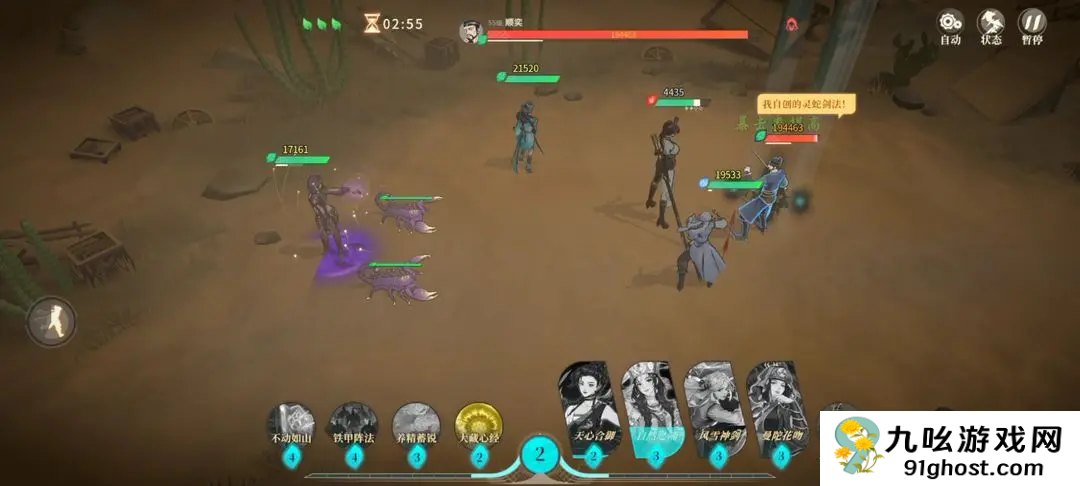 3、提前防御boss的高单体爆发:顺奕在剩余时间2:55秒时会念经 灵蛇剑法,大概3秒后他会释放威力超高的袖里藏刀,锁定后排角色,为了避免后排被秒,可以提前使用策略【大藏心经】或【金刚不坏】保护后排。