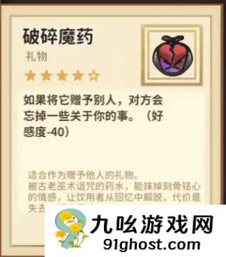 4、破碎魔药:冬火年一月可去“废弃港口”最左侧找“神秘男子”克罗斯购买“破碎魔药”(-40好感度)