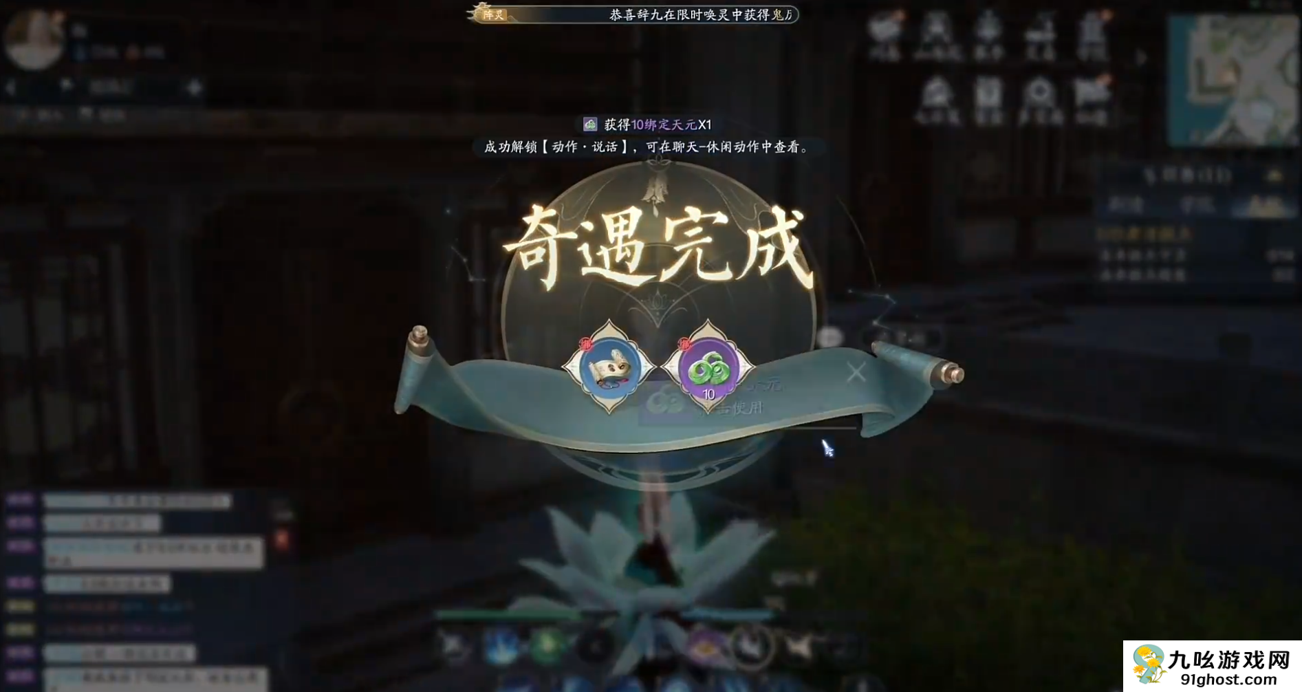 5、最后按照指示来完成一系列任务即可完成奇遇并获得奖励动作·说话和10绑定天元