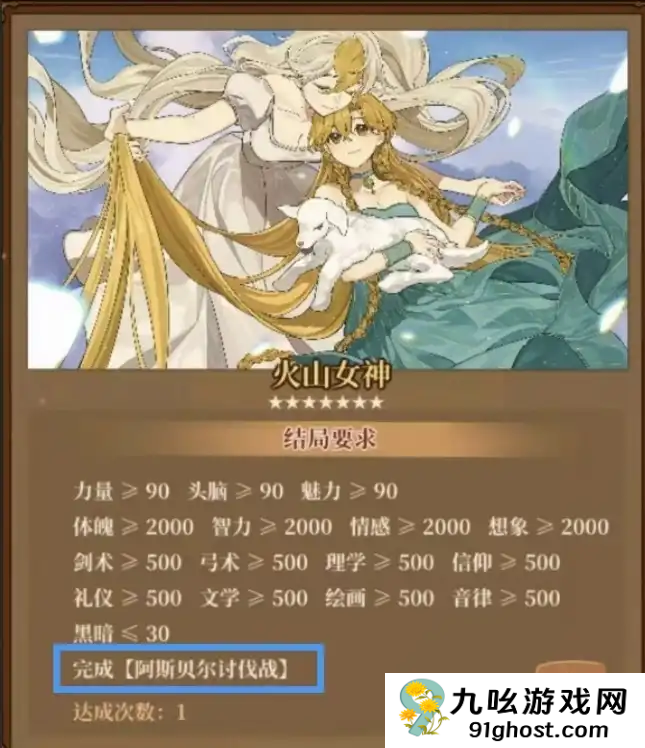 火山女神结局要求:力量≥90、头脑≥90、魅力≥90、体魄≥2000、智力≥2000、情感≥2000、想象≥2000、剑术≥500、弓术≥500、理学≥500、信仰≥500、礼仪≥500、文学≥500、绘画≥500、音律≥500、黑暗≤30、完成【阿斯贝尔讨伐战】