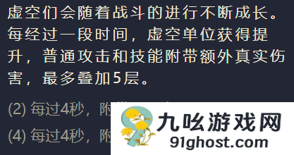 | 数量 | 效果 | 2虚空每隔一段时间,虚空们的普通攻击和技能将附带10%额外的真伤效果,最多叠加5层