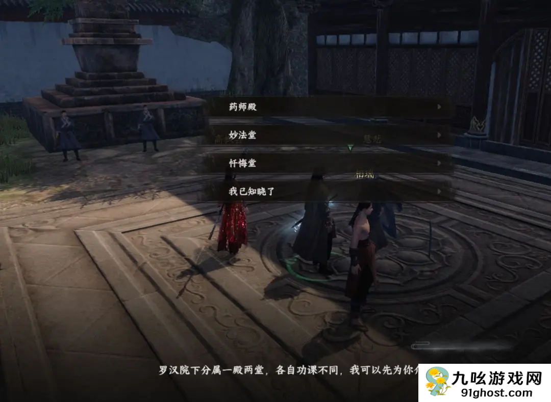 2、三个选项拜师任意选一个,然后会自动来到师傅旁边,交谈师傅修行后来到嵩室山守门弟子参加诵经大会