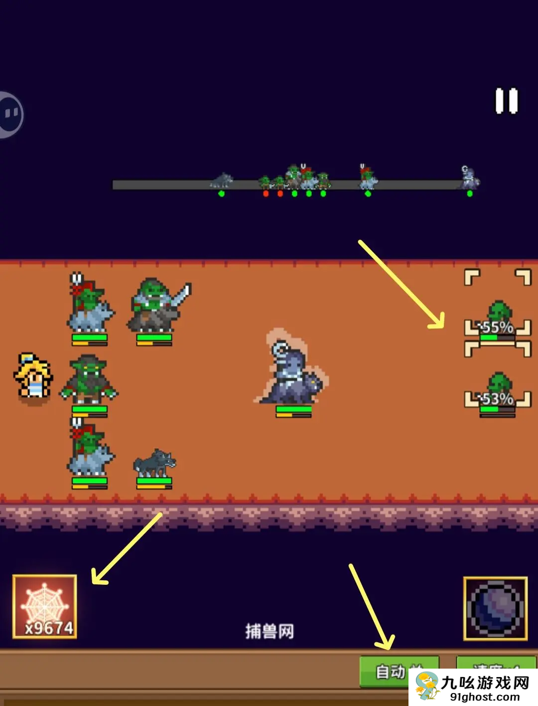在战斗里把自动关了,再点击左侧的捕兽网,再点敌方精灵即可抓,目标精灵损失的生命值越高抓捕的成功率也会越高